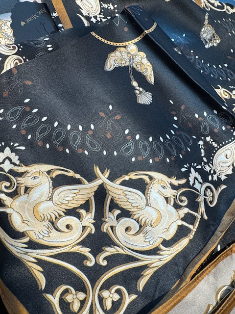 Rent silkeskjerf i sort med brune og champagne fargede mønster i. Nydelig lite skjerf til halsen, håret eller veska.