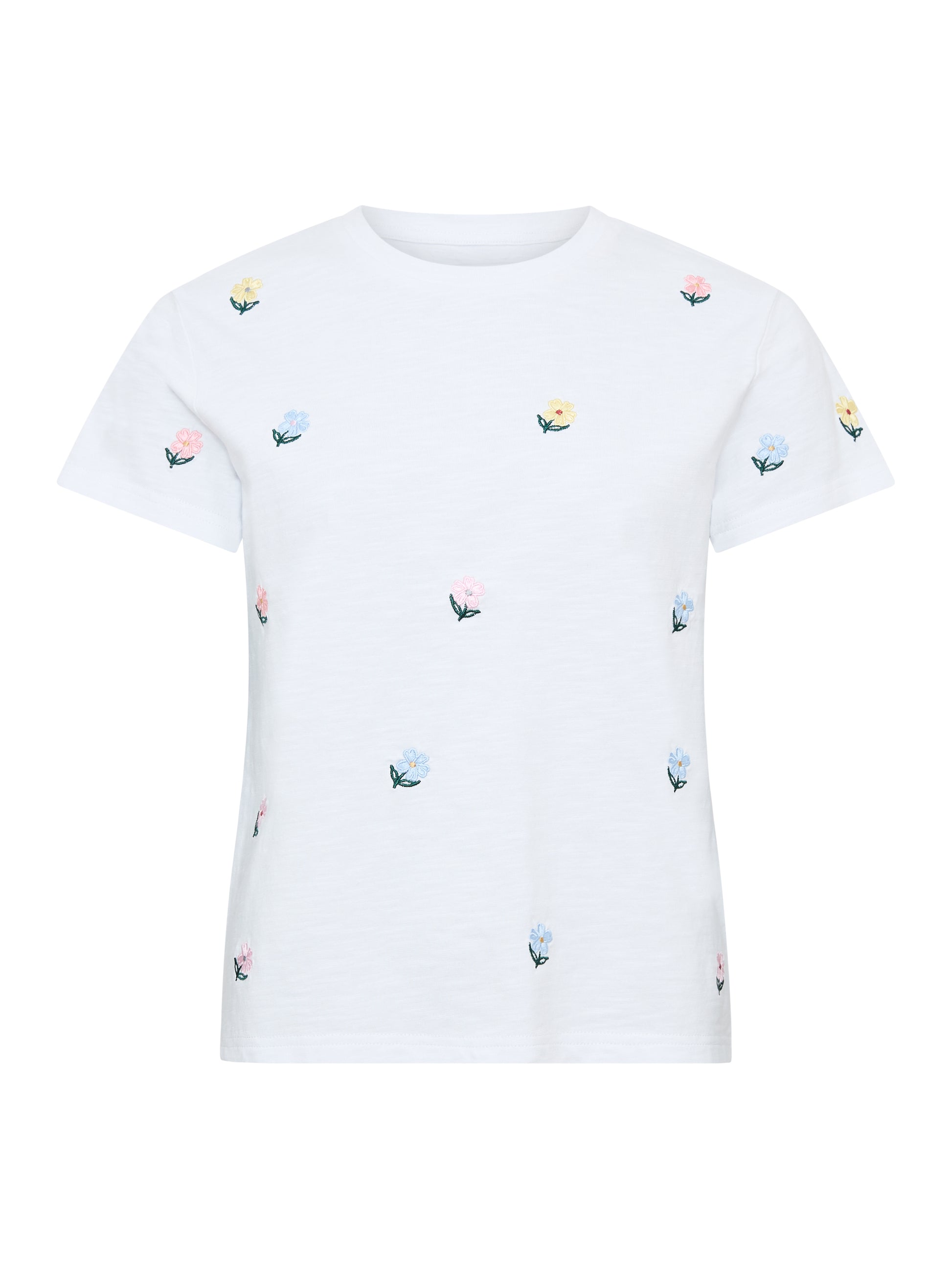 Nydelig hvit bomulls t-skjorte med søte små broderte blomster i rosa, blå, fersken og gul. Rund hals og helt rett i fasongen. Denne er superfin under ola jakka til våren.