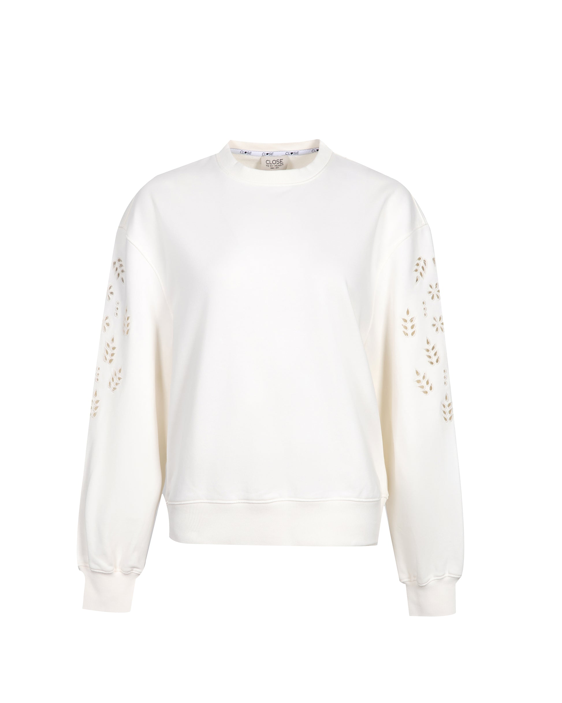 Deilig og fin genser fra norske Close i hvit. Vanlig college genser passform. På ermene er det hull mønster i som gjør den både feminin og søt.