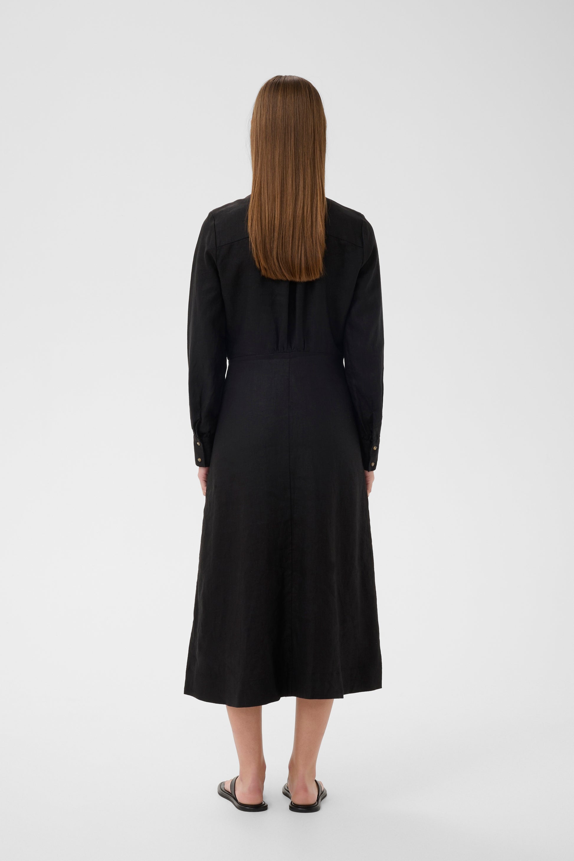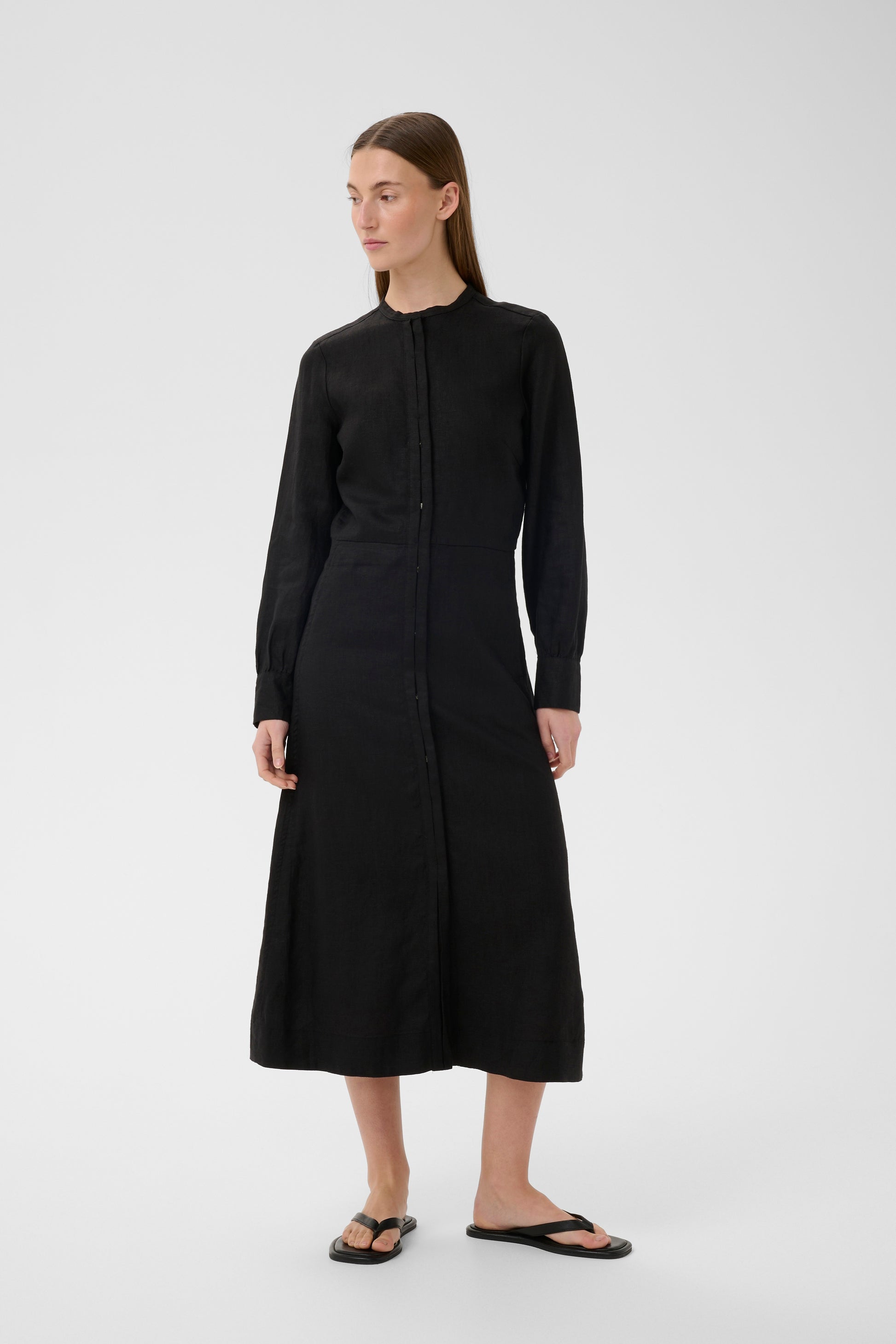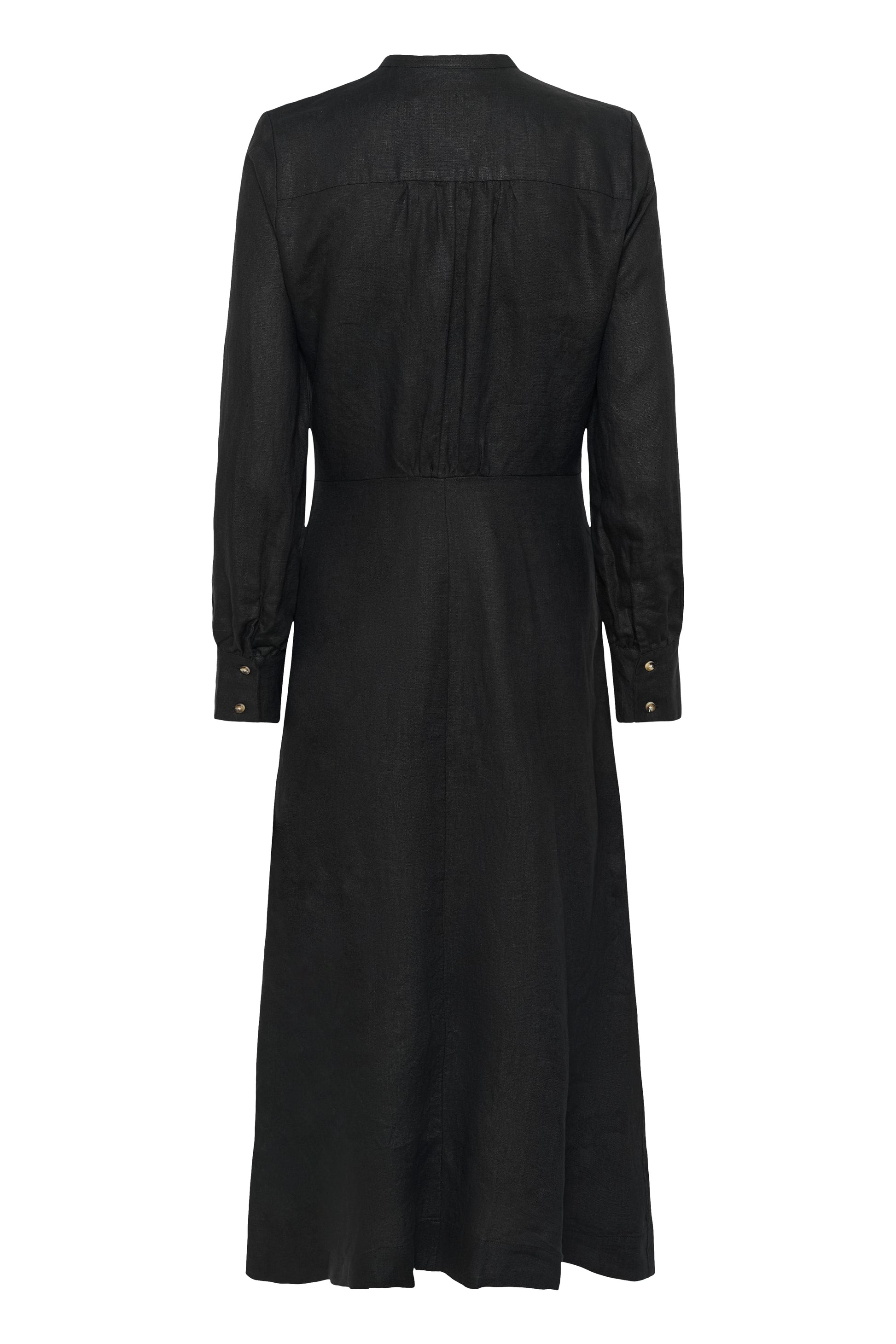Sort lang linkjole med lommer i siden, søm i livet og en a-fasong på skjørtet. Knapper hele veien med deobbel skulte sømmer. Kjolen har lange ermer med mansjetter og 2 knapper. Kina krage øverst. Denne er den ultimate go to kjolen denne sesongen.