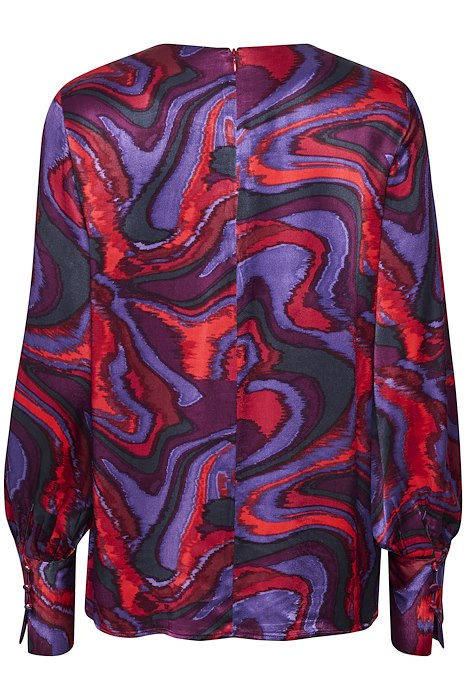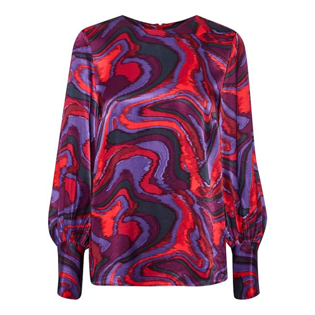 En nydelig bluse i tung viscose, et herlig print i spreke farger. Blusen har rund hals, glidelås bak og lange ermer med bred mansjett. Mansjetten har trekte knapper.