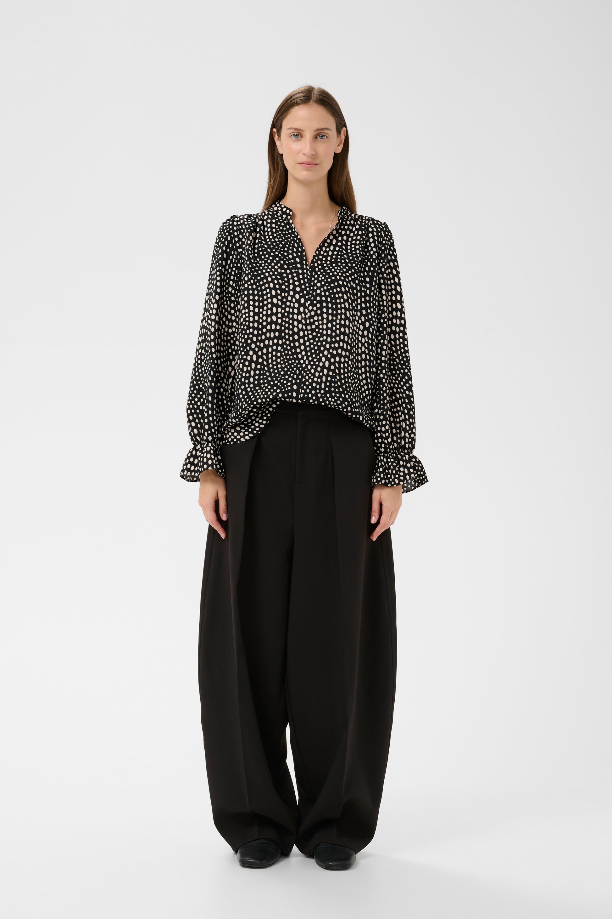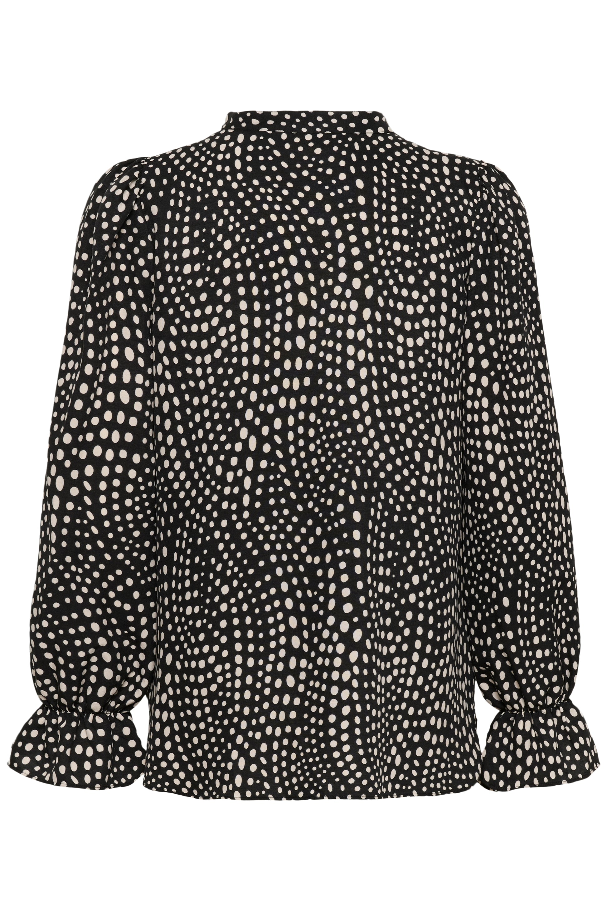 Lett fin bluse i sort med prikker i ecru. V-hals, lange ermer med strikk og avrundet kant. Kortere foran enn bak.
