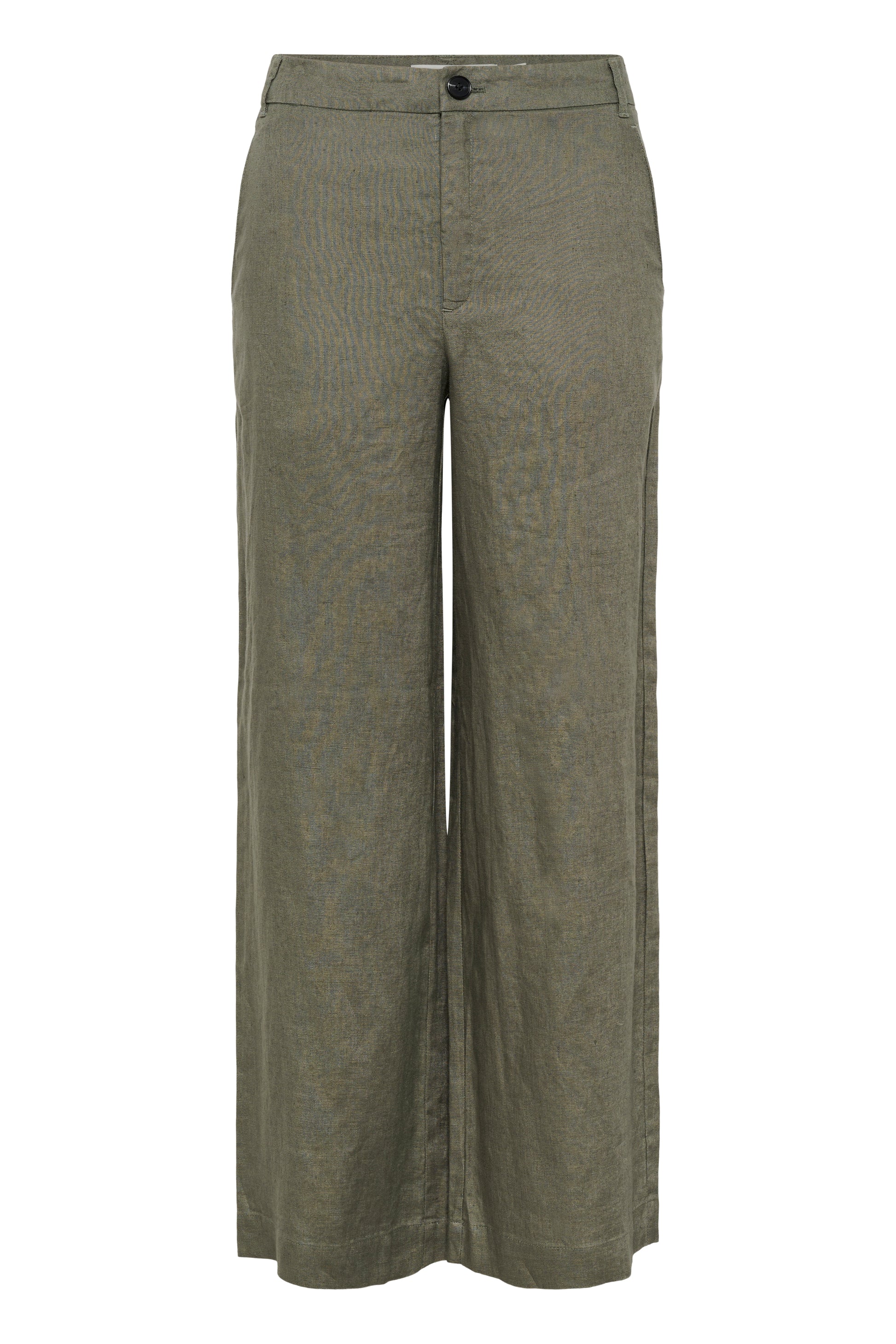 Rett linbukse med linning øverst, beltehemper og glidelås med knapp. Lommer i sidene og fake lommer bak. Vide deilige ben.