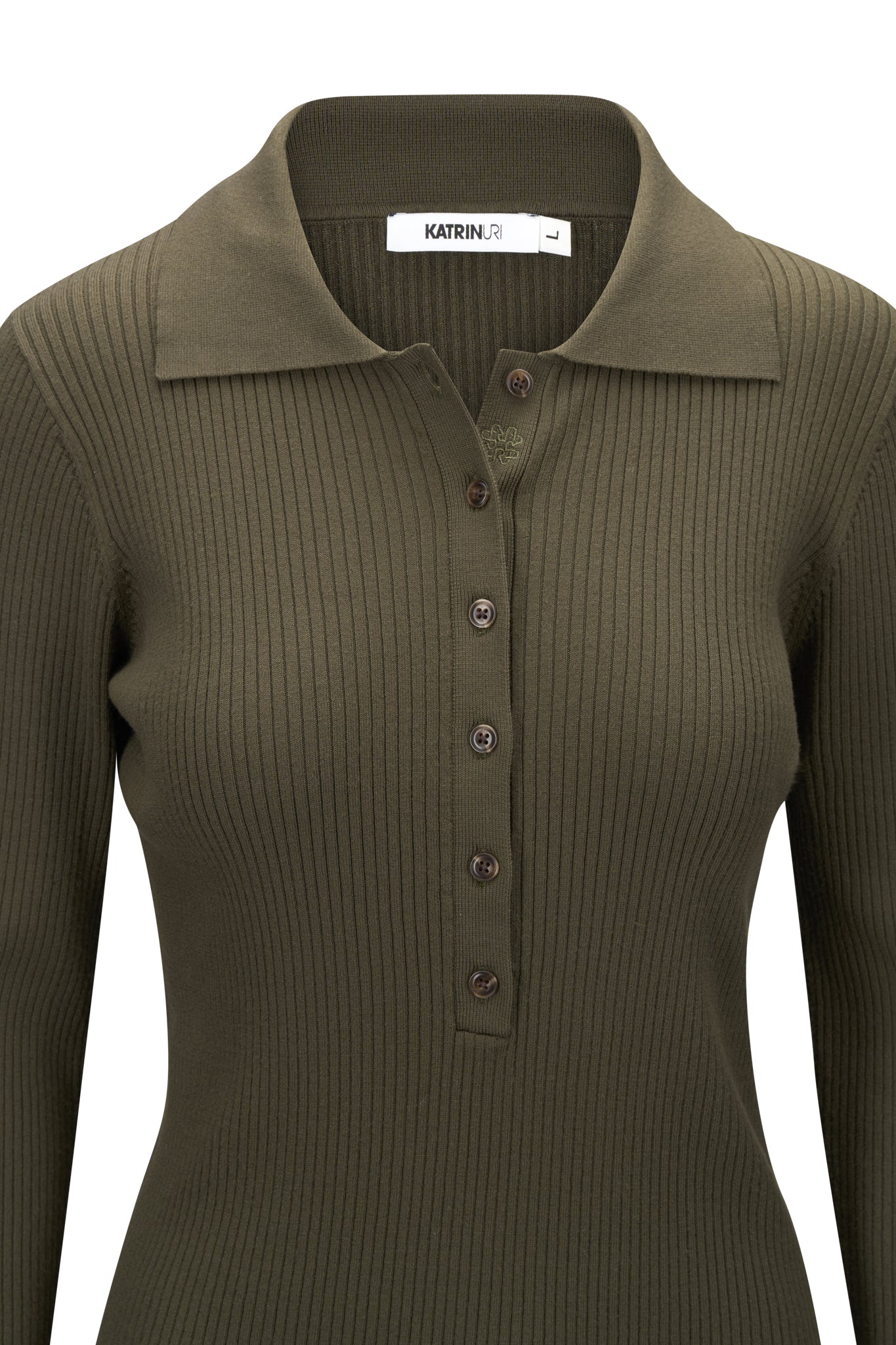 Genser fra norske Katrin Uri med krage og knapper halvveis ned. Ribbet genser i deilig myk stretchy kvalitet. Denne er like fin til jeans som til ett skjørt.