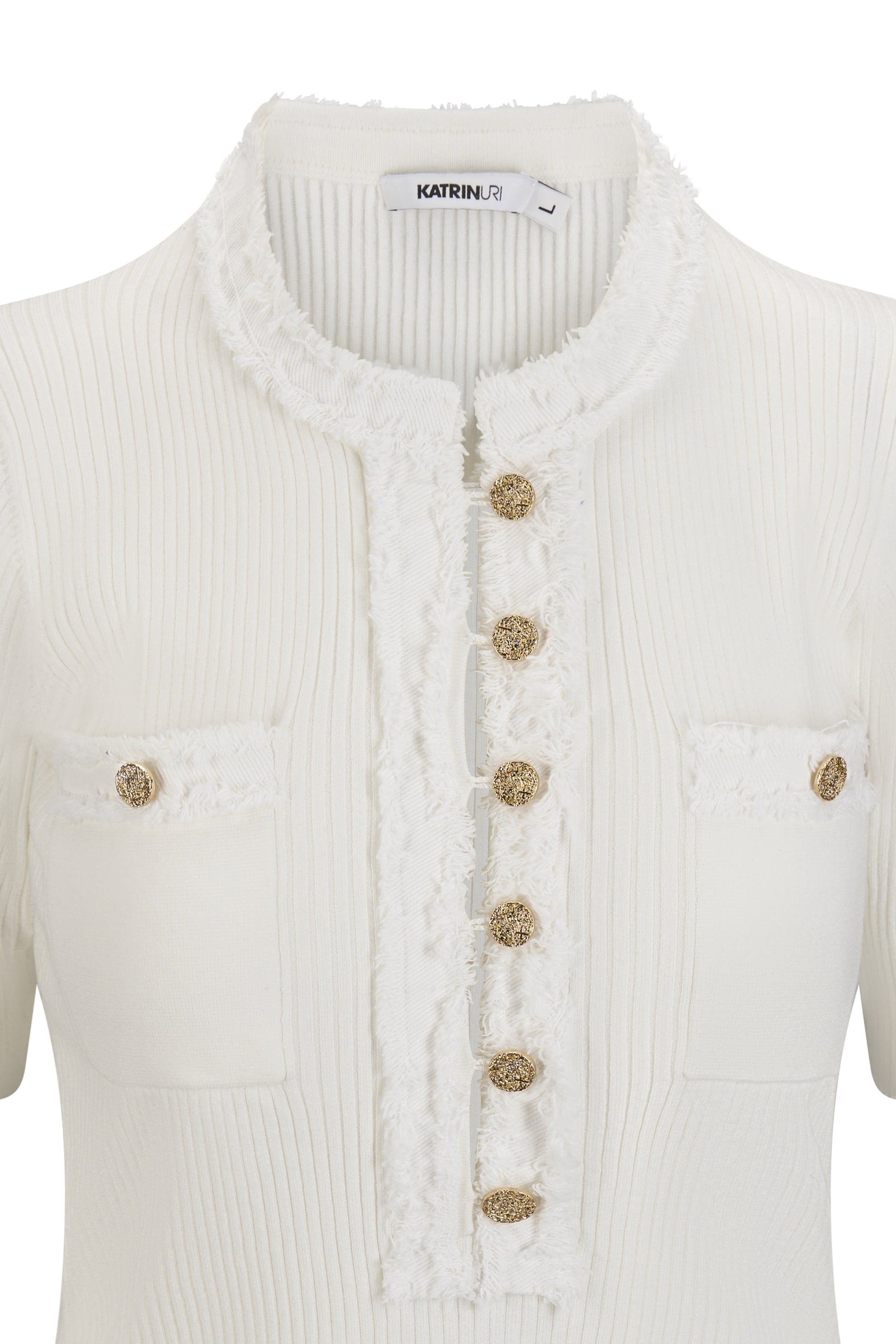 Hvit genser med kort erm. Dette er viskose strikken til norske Katrin Uri som også har de fineste gull knapper og detaljer på lommer. Rund hals og råkant både på lommene foran og på kragen.