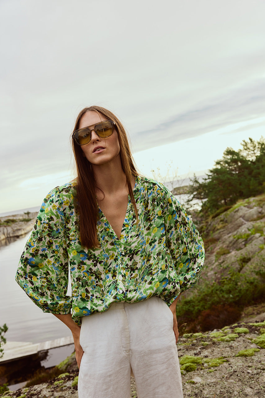 Bluse med knapper foran, v-hals og 3/4 dels erm med strikk fra Katrin Uri. Printet her er til å bli glad av! Grønt, gult og blått på en bakgrunn av hvit. Blusen er lett og ledig i deilig viskose. Avrundet kant nederst.
