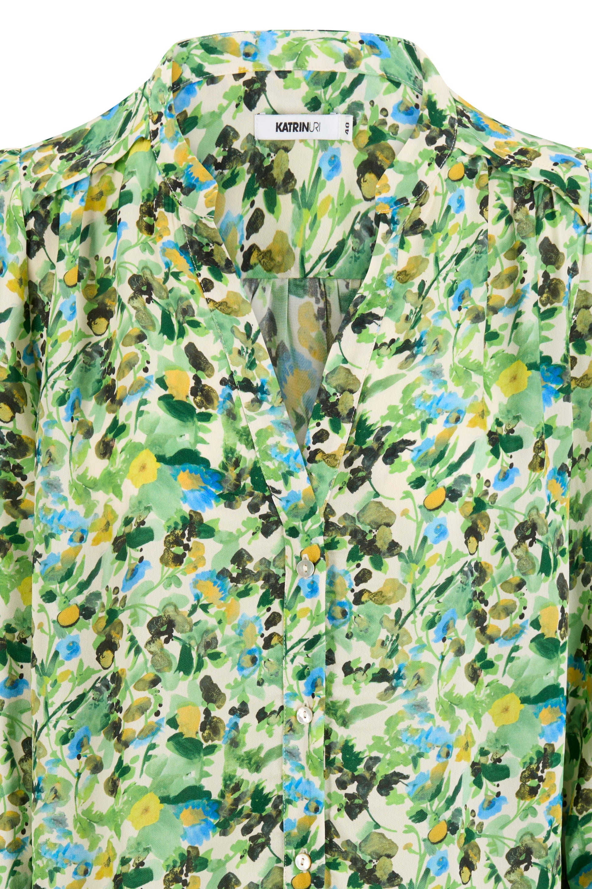 Midi lang kjole med stropper fra Katrin Uri. Printet her er til å bli glad av! Grønt, gult og blått på en bakgrunn av hvit. Kjolen har justerbare stropper og skjørtet er biaskjært nederst. Dette er den ultimate sommer kjolen for de varme dagene!