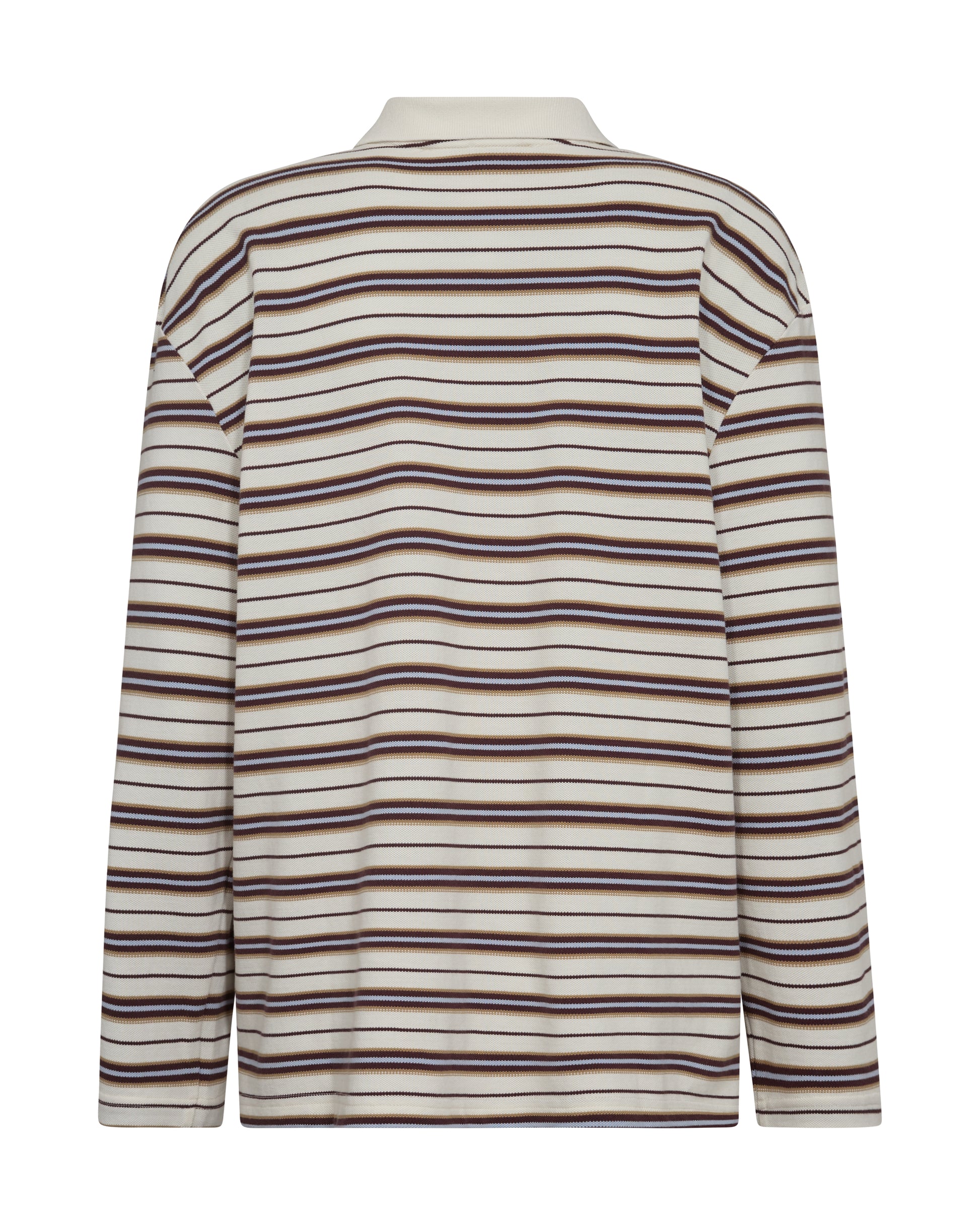 Superfin bomullsgenser med polo krage! Årets must have på gensere. Bunnen er creme og stripene er ulike størrelser og i blått og to brunfarger. Stor på størrelsen så her må man gå ned.