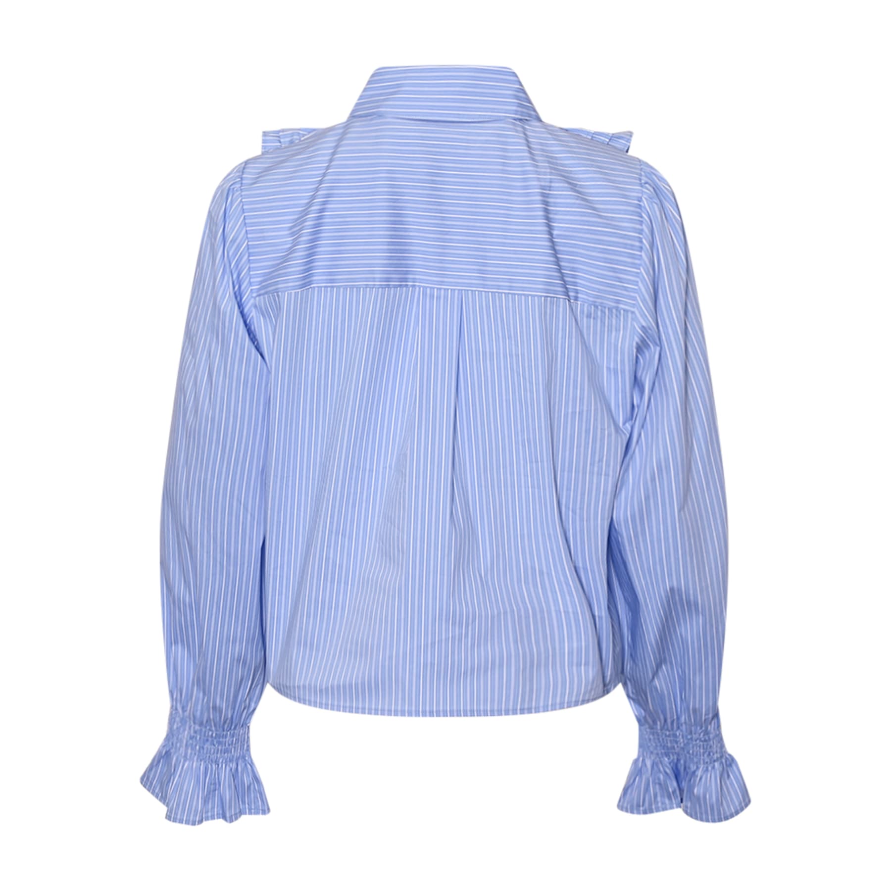 SUperfin og deilig blå skjorte med hvite små striper i ulike størrelser. Strikk på ermer med smock. Vamlig krage og knapping hele veien. Med rysj over fra midten.