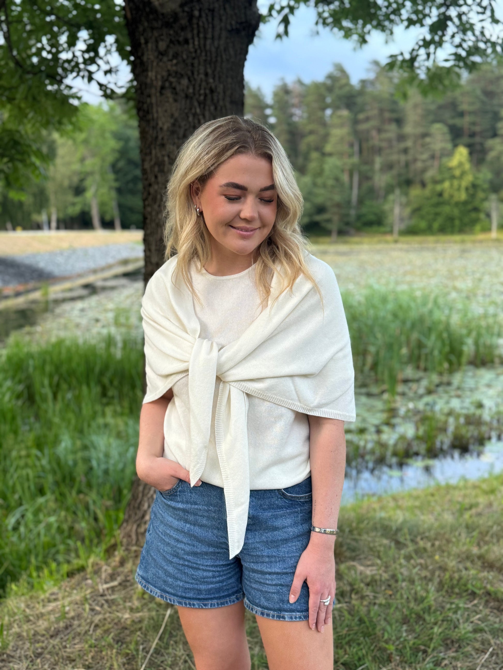 Hvit nydelig mykt trekant skjerf fra norsk Rève. Dette er fine sjal og skjerf som like godt kan brukes på vår og sommer som til høst og vinter