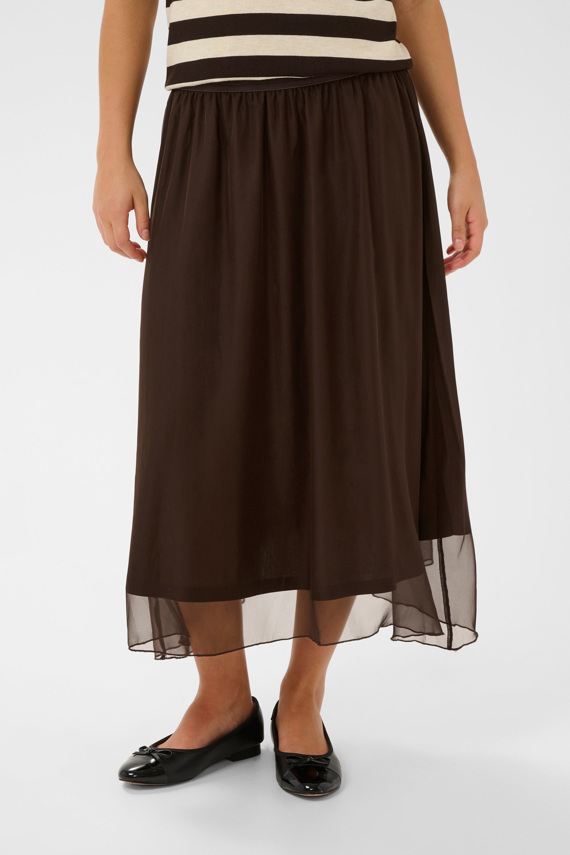 Nydelig lett skjørt i tynt materiale. Strikk i livet. Dette kan du røffe opp med en t-skjorte og strikk eller ha til en søt topp.