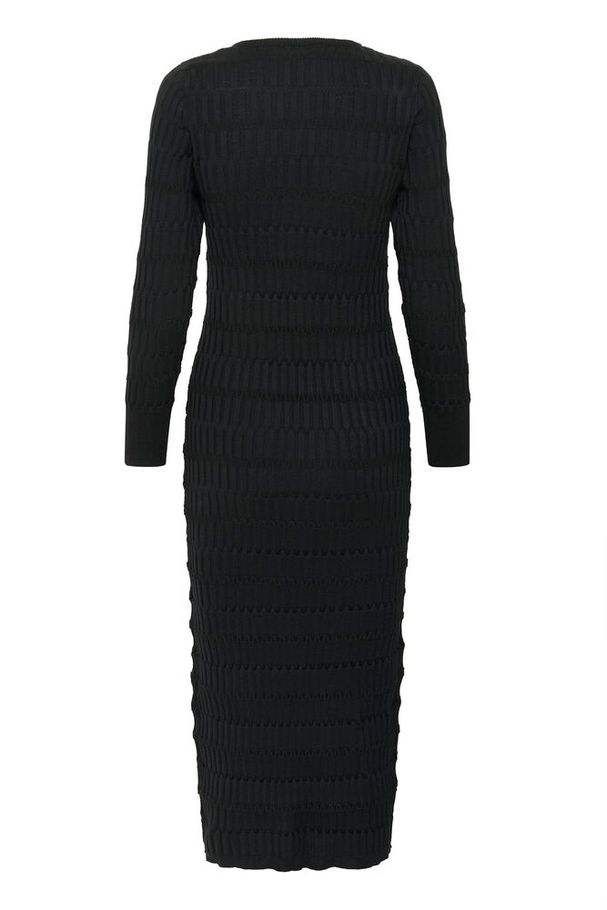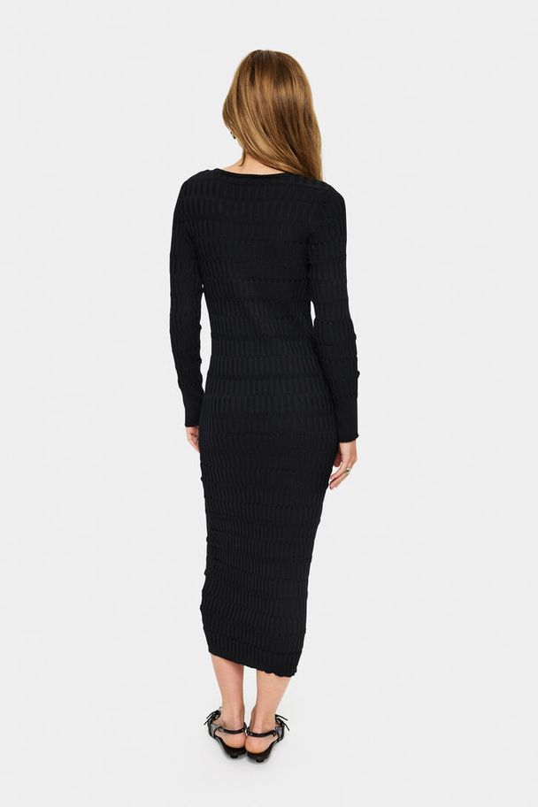 Supersøt enkel lang sort kjole med v-hals med en søt liten perle på. Struktur i hele genseren og den har ribb på ermer og nederst på kant.