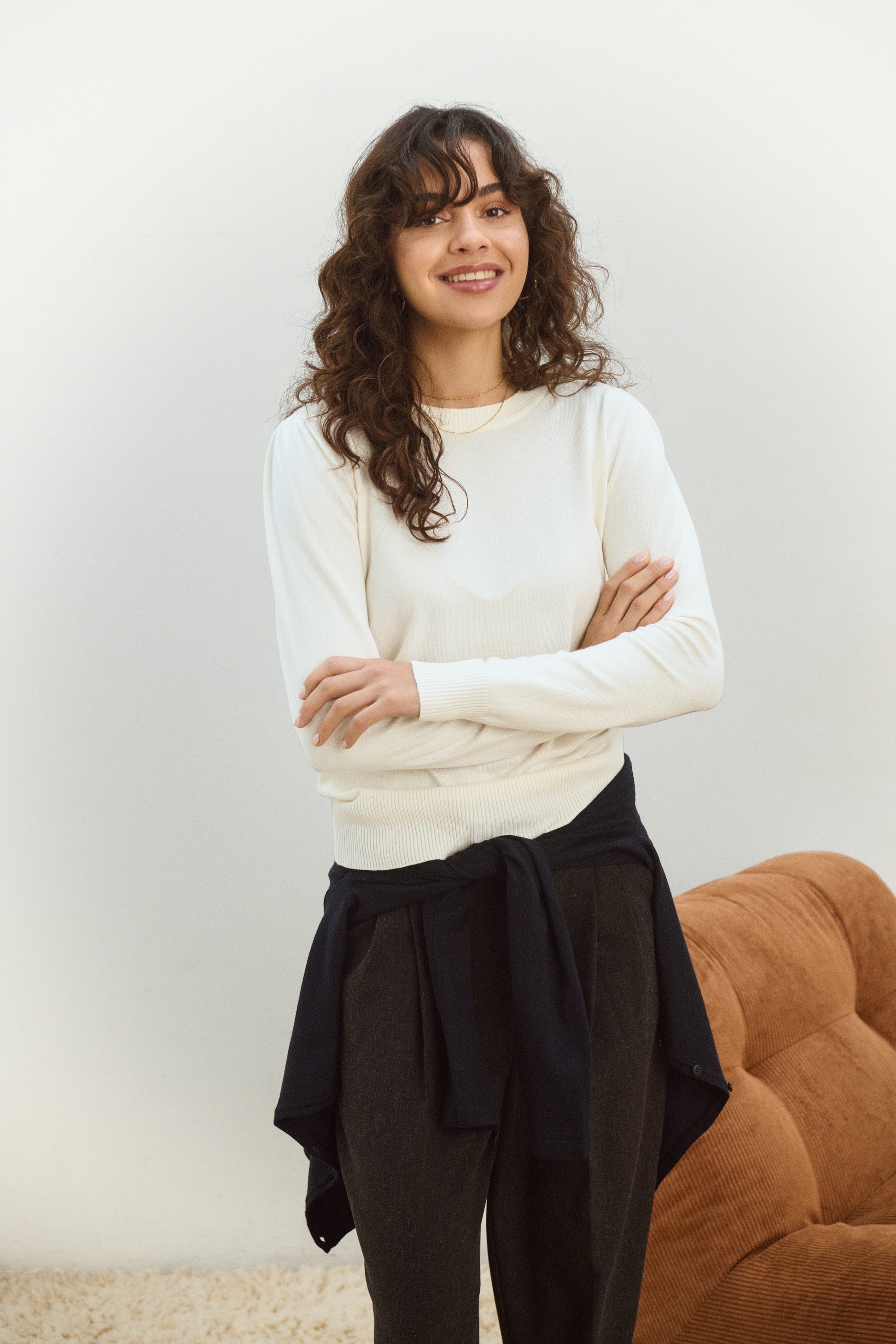 En myk og deilig genser med rund hals og en liten puff på skulderne. Ribbmansjetter rundt halsen, nederst på ermene og i livet. En genser som passer til det meste og som virkelig er et baseplagg i garderoben.