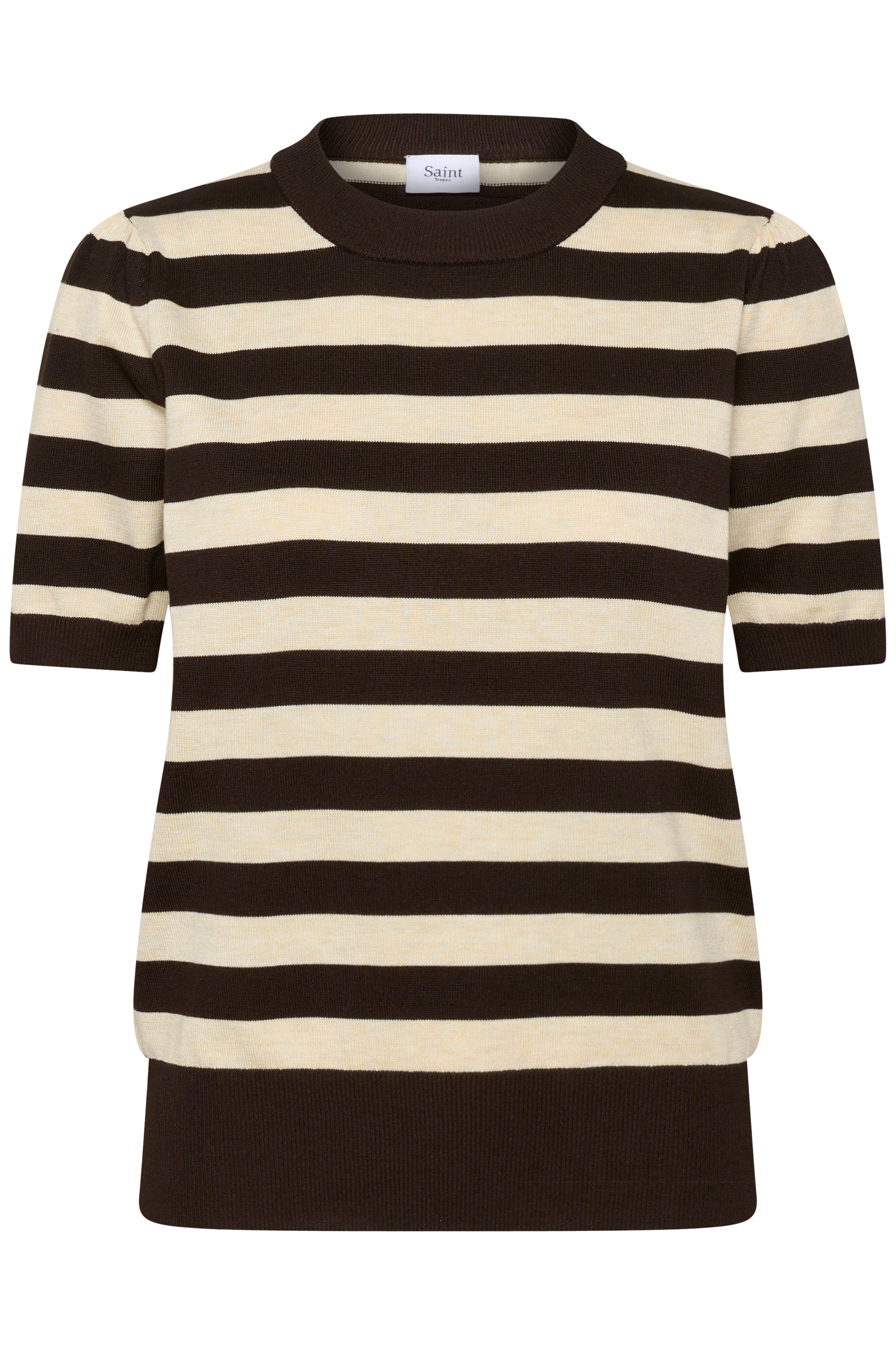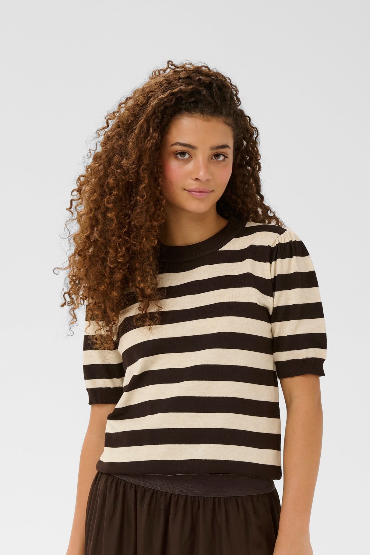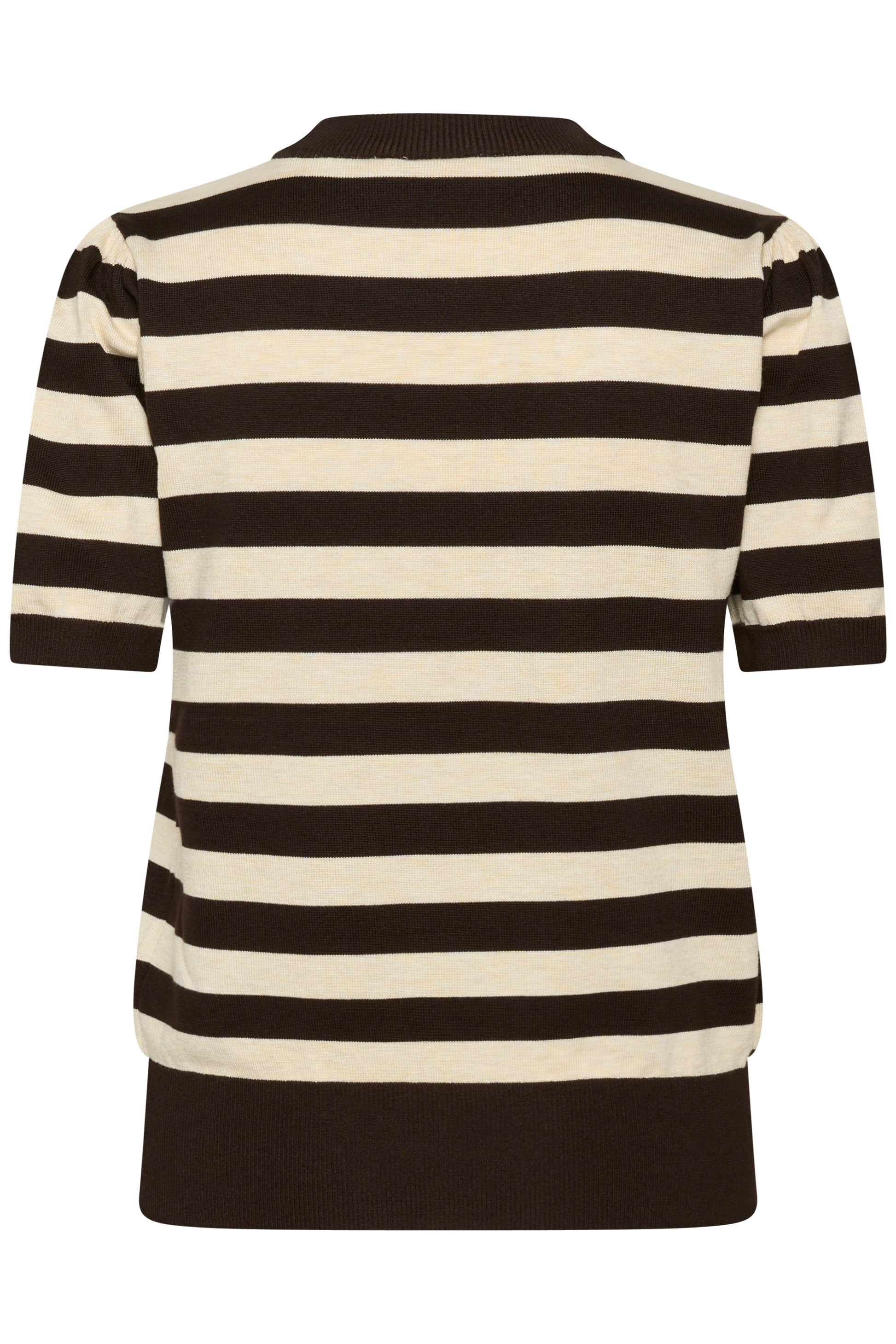 Favoritten Mila er nå her i kort ermet. Denne har mørke brune og beige striper! Rund hals som alltid og ermene går ned til albuen.