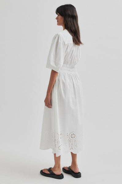 Nydelig hvit bomullskjole fra danske second female. Denne har smock i livet og blonde huller nederst. Ermen er god ned til albuen. En v-hals kjole. Dette er den ultimate sommerkjolen til alle anledninger.