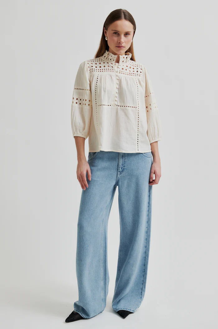 Nydelig bomulls bluse fra danske Second Female. Denne blonde hulle blusen er ett smykke av en topp. Trukkede knapper med strikk nedover halve blusen. Ermene er 3/4 dels lengde med strikk. Hulle detaljer hele veien og rett kant nederst.